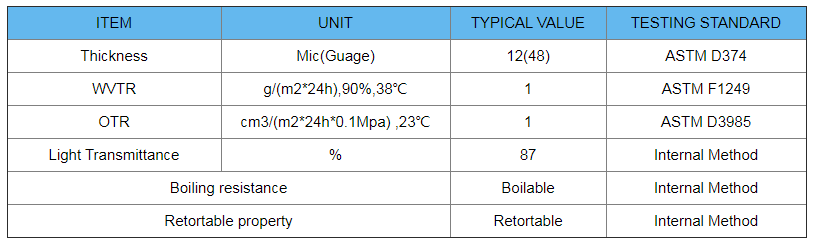 Phim thú cưng được phủ alox đạt được tính chất rào cản kém hơn lá nhôm bằng cách đặt lớp phân tử alox chặt chẽ vào màng chất nền PET. Hiện tại, thuộc tính rào cản tốt hơn của Changyu có thể nhận được giá trị OTR và giá trị WVTR cả dưới 1.0, với thông tin chi tiết như dưới đây.